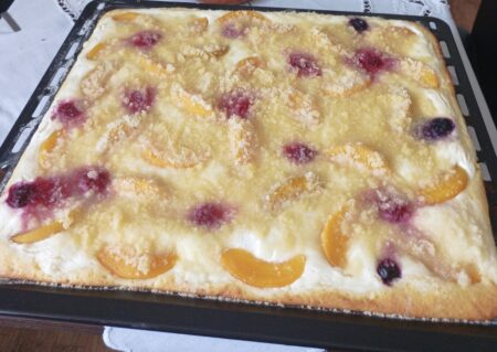 Recept na velký rodinný koláč s tvarohem a ovocem a bleskové sušenky